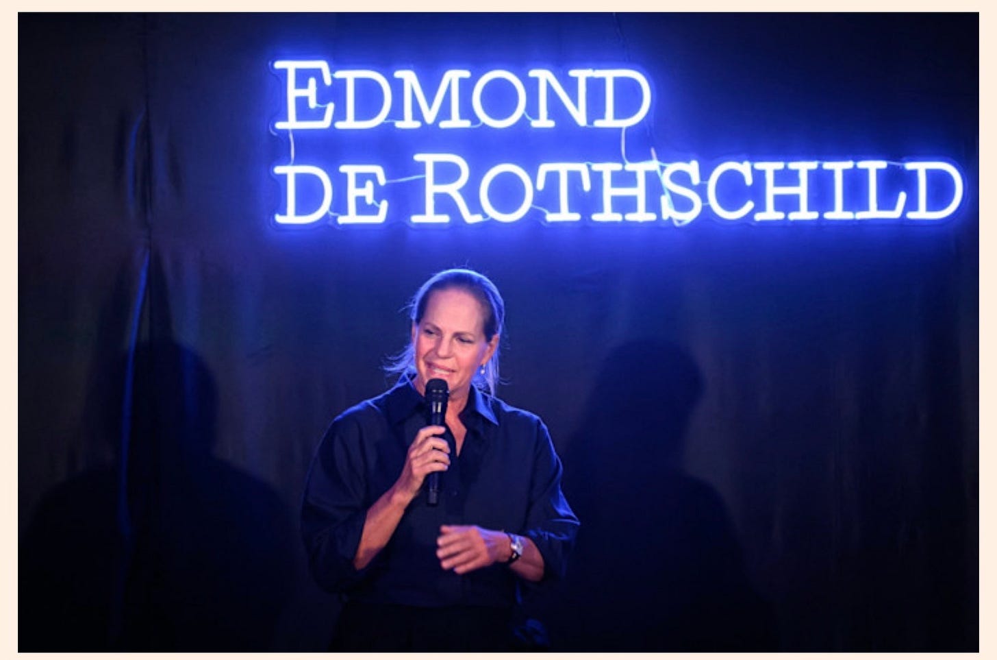 There is a photograph. A woman stands at a podium beneath a blue neon sign, well dressed, composed, speaking with the particular authority of someone who has never had occasion to doubt that the room is listening. Behind her, glowing like an accusation no one in that room appears to have noticed, are the words: EDMOND DE ROTHSCHILD